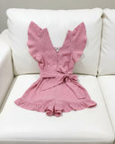 "KC" Pink Dot Flutter Sleeve Ruffle Hem Romper: Small